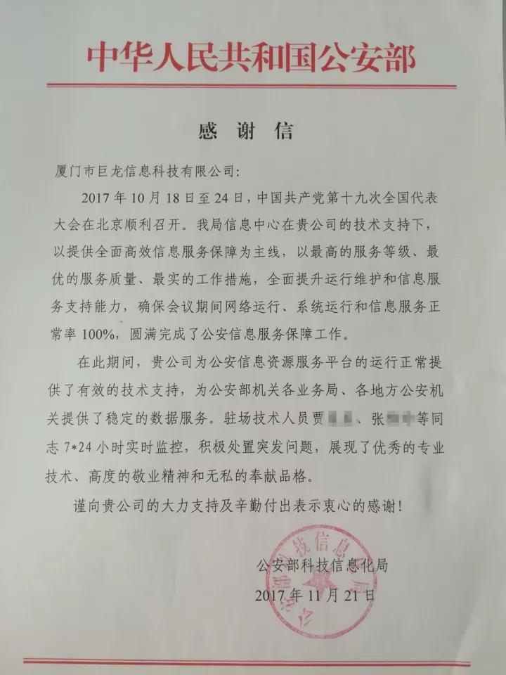 扎实的服务工作赢得了客户的信任, 巨龙信息收到了来自公安部的感谢信,对我司在十九大期间的技术保障工作 给予了充分的肯定,并对公司的大力支持表示感谢。