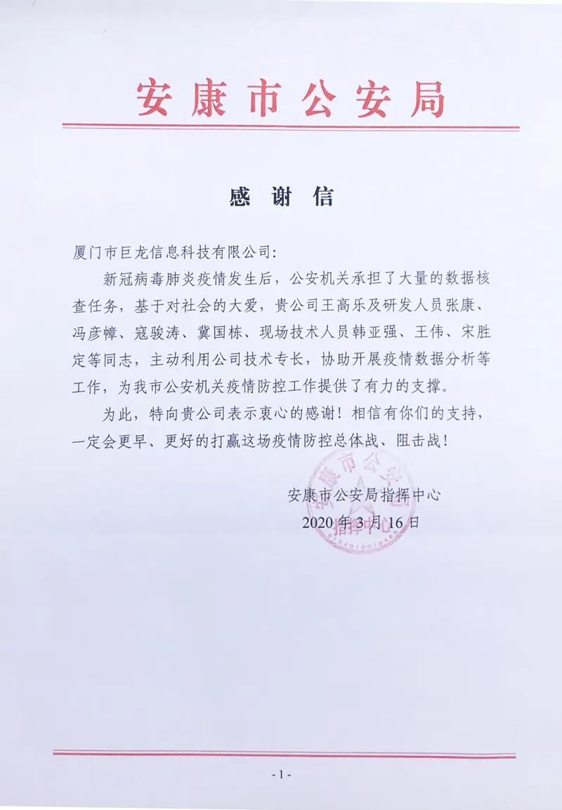 自从疫情防控阻击战打响以来,陕西安康市公安一线民辅警星夜驰援,与时间赛跑,在后方运用大数据分析为防控疫情提供“智慧”支撑,全方位抗击疫情防控工作。在这场“战役”中,巨龙信息公司技术人员积极配合,通过大数据的助力,让一线部门在源头防控排查和疫情监测、预警工作中更加“耳聪目明”,近日,安康市公安局指挥中心向巨龙信息发来感谢信,感谢公司团队在疫情防控中提供的有力技术支撑。