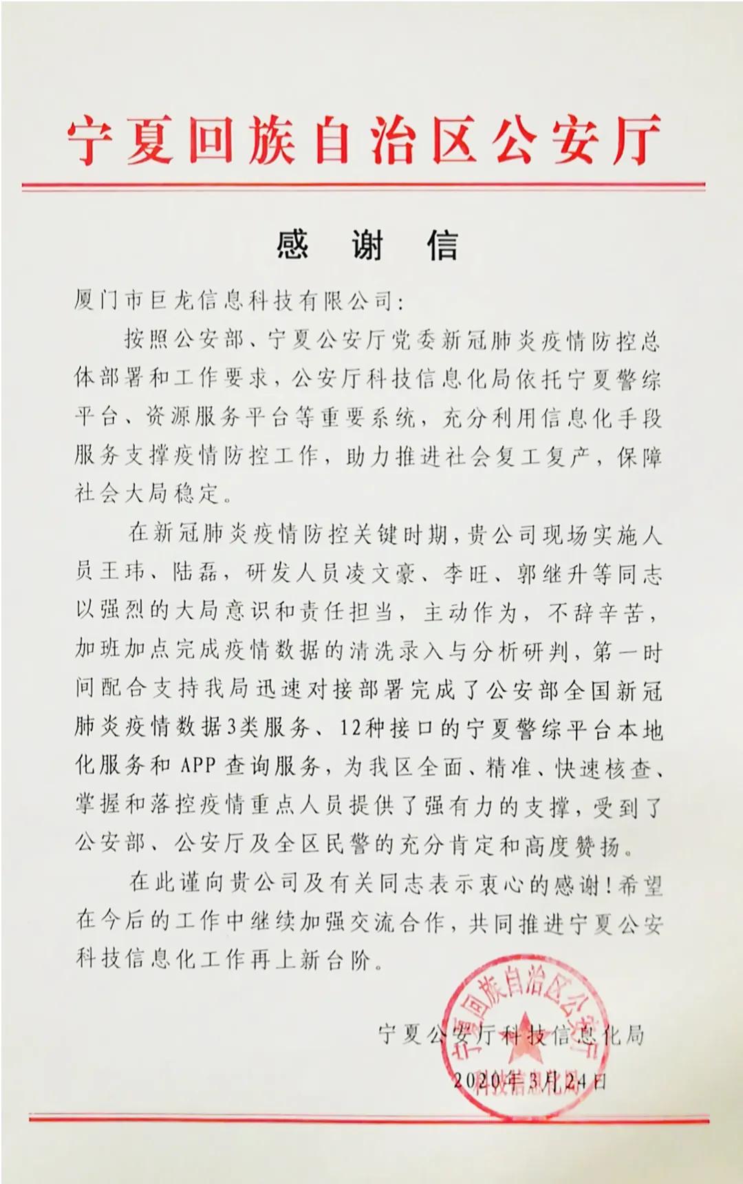 为有效防控疫情,宁夏公安充分利用信息化手段支撑疫情防控,保障社会大局稳定。在此期间巨龙信息提供了优质高效的信息化技术支持和服务,收到了来自宁夏公安厅科技信息化局的感谢信!