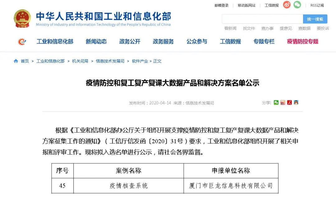 日前,工业和信息化部公布了“疫情防控和复工复产复课大数据产品和解决方案公示名单”,巨龙信息的“疫情核查系统”成功入选。