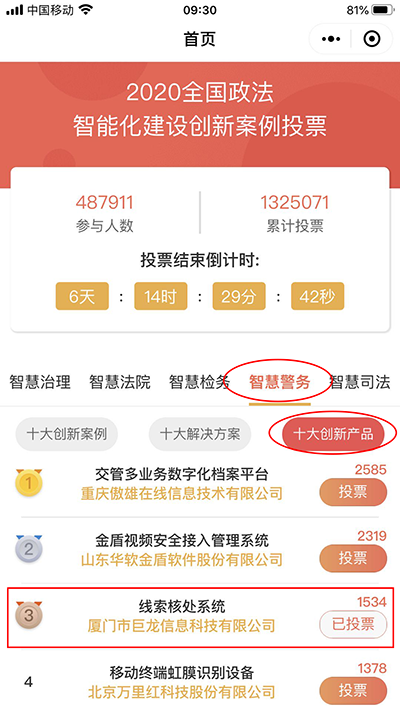 进入投票小程序后,点智慧警务——投十大创新产品,找到 “线索核处系统”投票。