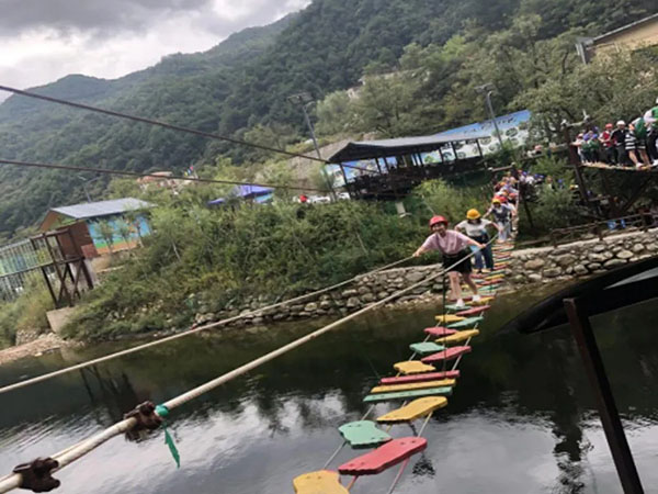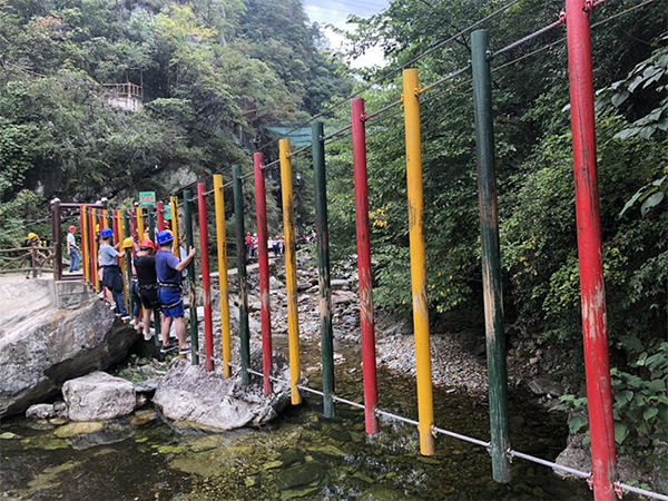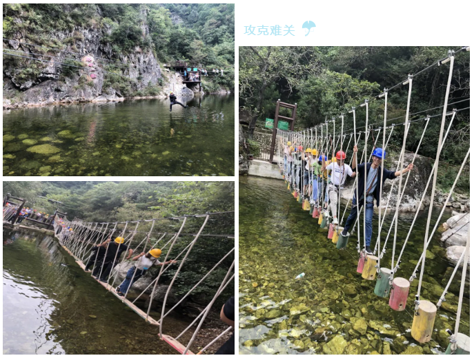 大家来到峡谷运动乐园一起开启闯关游戏。小伙伴们齐心协力,携手并进,一起穿越大脚丫、缅甸桥,挑战抽板过河、高空独木桥、高空滑索、飞夺泸定桥、荡绳过河等17个项目。整个团队默契配合,相互鼓励,相互帮助,一起攻克难关,赢得终点。