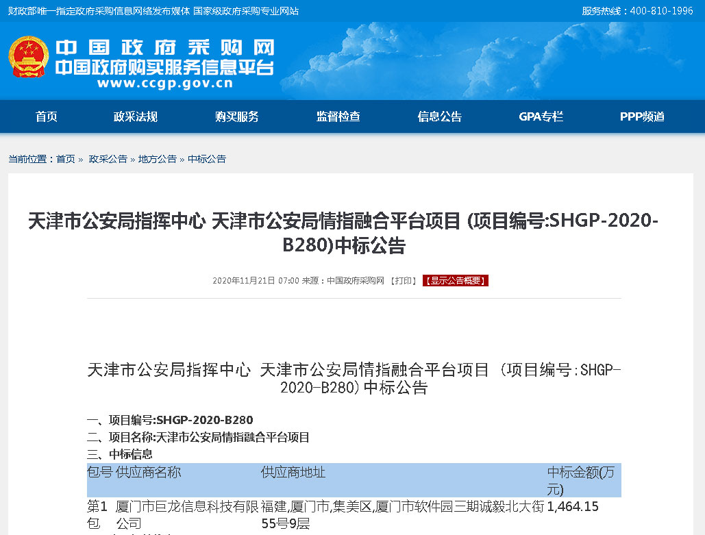 近日,继天津市公安局大数据基础工程建设通用应用综合能力开发项目顺利中标后,巨龙信息又成功中标天津市公安局情指融合平台项目。项目的双双中标,进一步肯定了公司的综合实力。