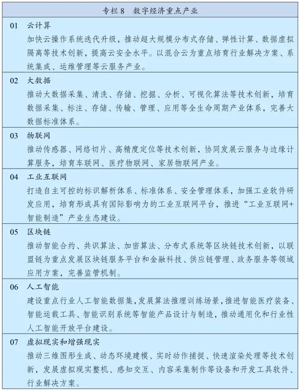 培育壮大人工智能、大数据、区块链、云计算、网络安全等新兴数字产业,提升通信设备、核心电子元器件、关键软件等产业水平。构建基于5G的应用场景和产业生态,在智能交通、智慧物流、智慧能源、智慧医疗等重点领域开展试点示范。鼓励企业开放搜索、电商、社交等数据,发展第三方大数据服务产业。促进共享经济、平台经济健康发展。