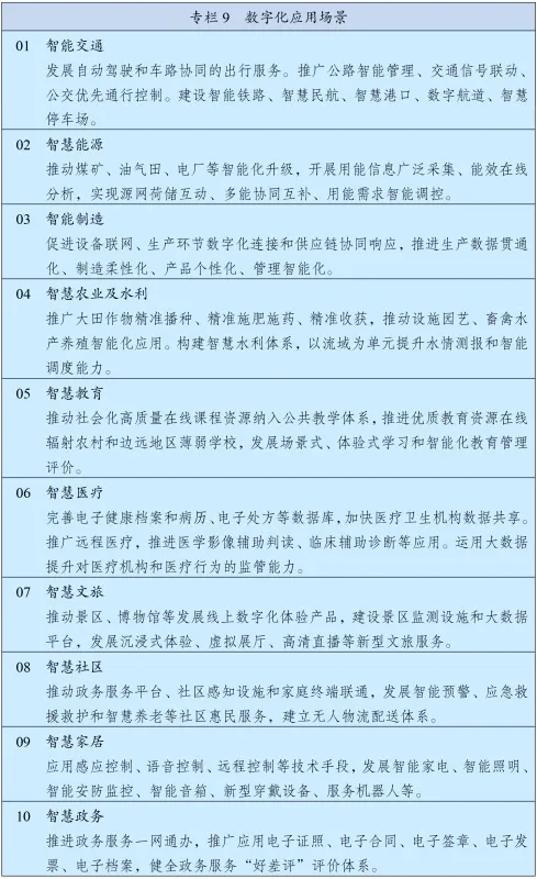 以数字化助推城乡发展和治理模式创新,全面提高运行效率和宜居度。分级分类推进新型智慧城市建设,将物联网感知设施、通信系统等纳入公共基础设施统一规划建设,推进市政公用设施、建筑等物联网应用和智能化改造。完善城市信息模型平台和运行管理服务平台,构建城市数据资源体系,推进城市数据大脑建设。探索建设数字孪生城市。加快推进数字乡村建设,构建面向农业农村的综合信息服务体系,建立涉农信息普惠服务机制,推动乡村管理服务数字化。