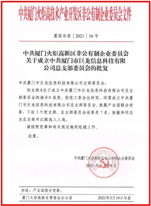 公司于2002年6月成立党支部委员会,因公司经营升级企业名称变更,于2016年7月变更为中国共产党厦门市巨龙信息科技有限公司支部委员会。2002年至今,我司党建相关工作得到了上级的高度认可,荣获了相关荣誉奖项。在各级党委的高度重视下,按照上级党委的安排部署,公司党支部在高质量发展的步伐中,不断做精做专做强做大,我司党建工作得到了质的提升。巨龙信息党支部成功升格为党总支,是上级党委对我司党建工作的肯定,同时公司党建文化厅的启用,标志公司党建工作进入新阶段,也是公司发展的重要里程碑。