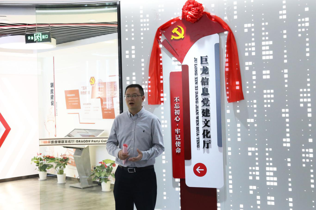 随后,火炬高新区直属党委专职副书记、火炬非公党委副书记张卫松,火炬高新区产业园联合党委书记许峰与我司张敏玲书记、鲍峰副书记共同为“巨龙信息党建文化厅”揭牌。