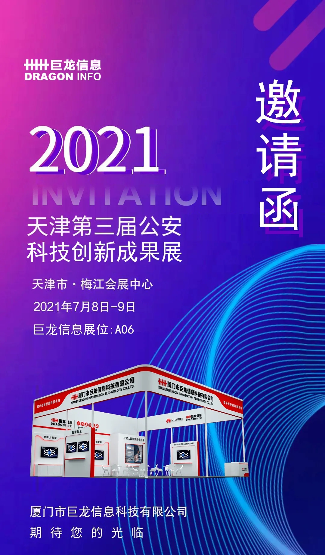 您好!非常感谢您对巨龙信息长期以来的支持和信任,我司将参展2021年7月8—9日“天津第三届公安科技创新成果展”,届时,我司将展示最新的智能化产品、解决方案及应用案例。我们在此真诚期盼您莅临参观指导,恭候您的到来!