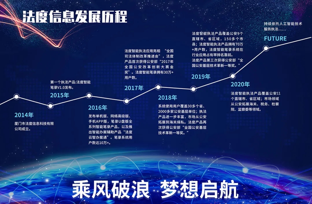 接下来,巨龙信息副总裁兼法度信息总经理张云生以《回顾·总结·展望》为主题,对一直以来陪伴法度公司成长,在各自岗位上辛勤耕耘的同仁致以最诚挚的感谢!并对过去7年公司的发展进行了深情回顾:自2014年成立以来法度信息始终致力于“用科技为法治中国服务”的大格局,积极响应国家在智能执法领域不断推出的新政策,逐渐构建了以“数据知识-技术能力-智能执法服务-执法系列应用”为支撑的智能执法产品体系;产品服务也从最初的公安扩展到市场监督管理、海关、税务、检察院、监察委等更多领域;法度公司以及以法度智能笔录为主的系列执法产品在行业内拥有较高的知名度。