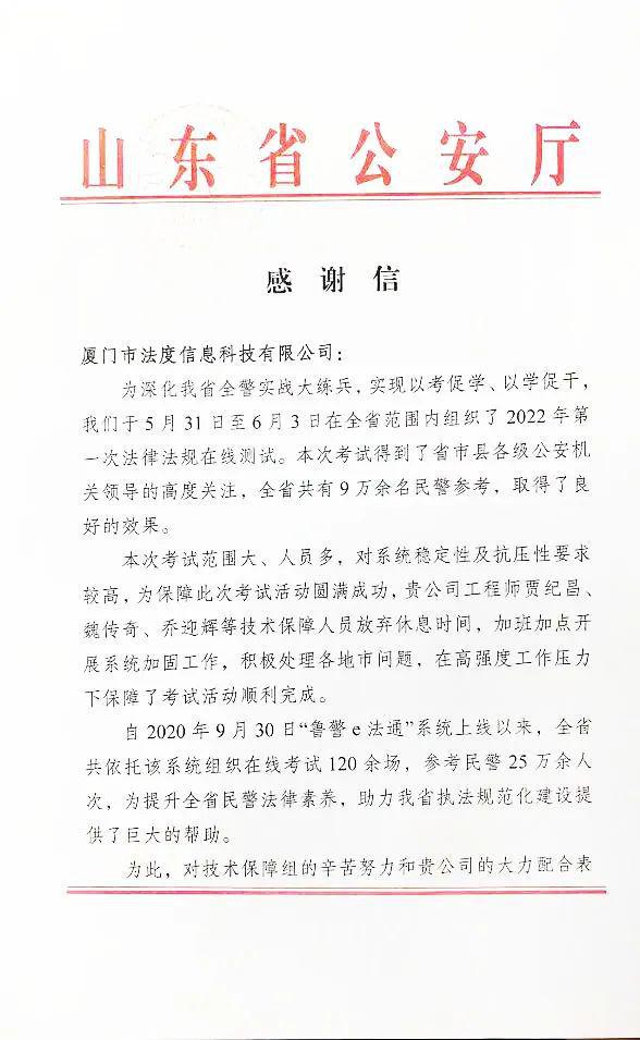 近期,山东省为深化全警实战大练兵,实现以考促学、以学促干,在全省范围内组织了一次法律法规在线测试,全省9万多名民警参加测试,取得了良好的效果。法度信息相关人员应急响应及时,措施保障得力,在高强度工作压力下保障考试活动顺利完成,山东省公安厅为此发来感谢信。