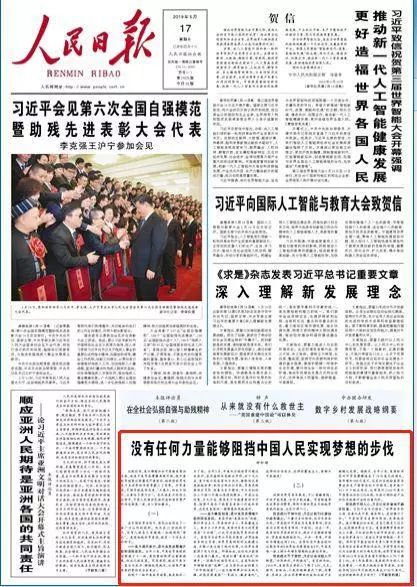 人民日报头版就中美贸易摩擦发布评论员文章《没有任何力量能够阻挡中国人民实现梦想的步伐》。