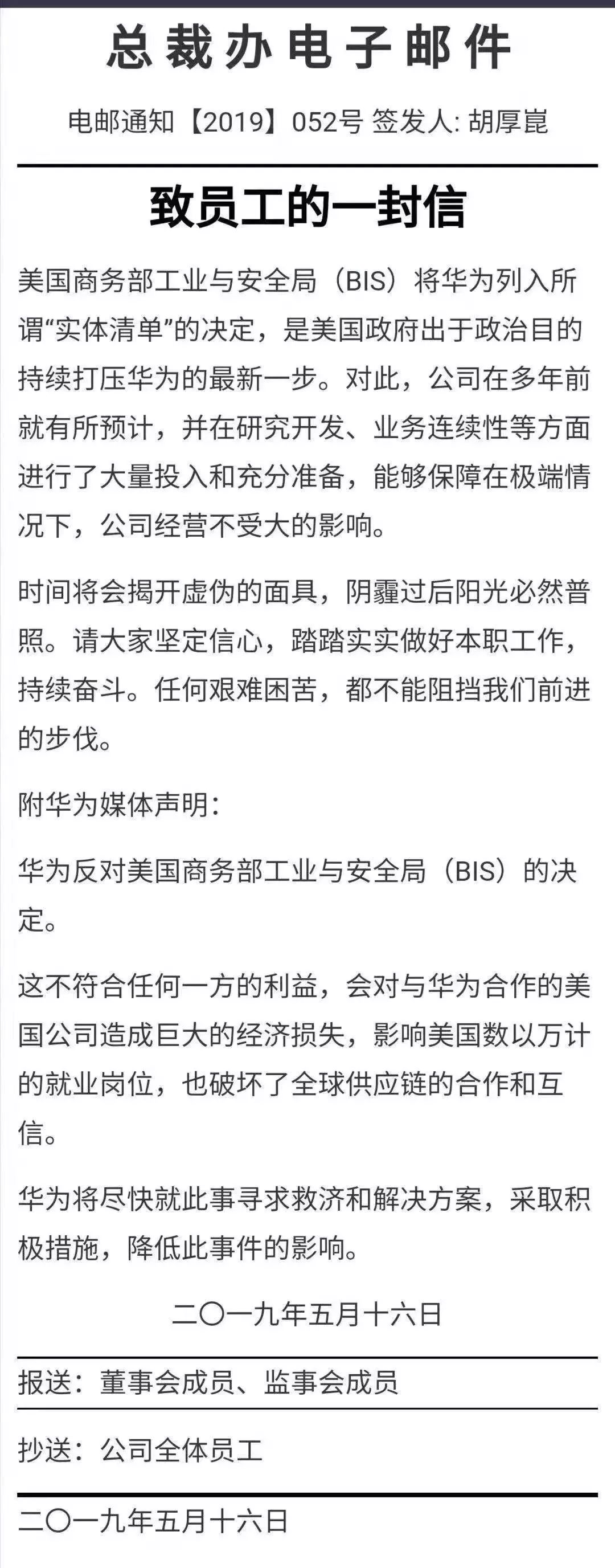 华为称,美国商务部工业与安全局(BIS)将华为列入所谓“实体清单”的决定,是美国政府出于政治目的持续打压华为的最新一步。对此,公司在多年前就有所预计,并在研究开发、业务连续性等方面进行了大量投入和充分准备,能够保障在极端情况下,公司经营不受大的影响。请大家坚定信心,踏踏实实做好本职工作,持续奋斗。任何艰难困苦,都不能阻挡我们前进的步伐。