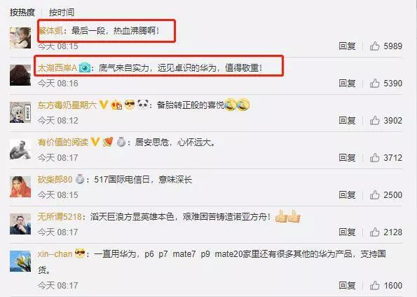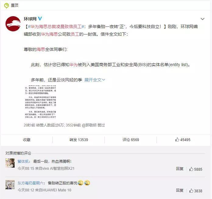 华为海思内部信发布,引发网络热烈刷屏关注,网友纷纷为华为打气鼓劲:“底气来自实力,远见卓识的华为,值得敬重”、“居安思危,心怀远大”、“一直用华为产品、支持国货”、“加油、华为”、“看得掉泪了,很震撼,很鼓舞人心!”。
