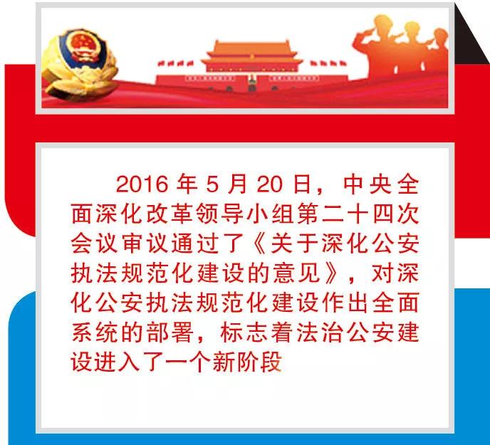 2016年5月20日,中央全面深化改革领导小组第二十四次会议审议通过了《关于深化公安执法规范化建设的意见》(以下简称《意见》),对深化公安执法规范化建设作出全面系统的部署,标志着法治公安建设进入了一个新阶段。