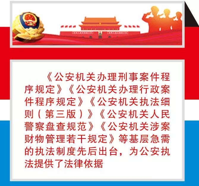 ——强化公安执法制度建设。在公安部的推动和努力下,《公安机关办理刑事案件程序规定》《公安机关办理行政案件程序规定》《公安机关执法细则(第三版)》《公安机关人民警察盘查规范》《公安机关涉案财物管理若干规定》等基层急需的执法制度先后出台,为公安执法提供了法律依据。