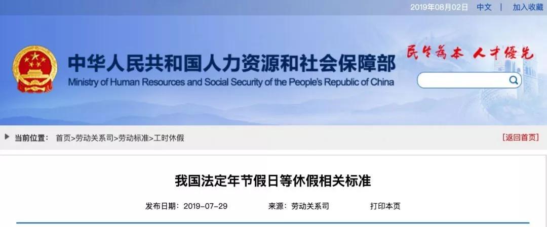 8月1日,人社部官网发布《法定年节假日等休假相关标准》,对包括休息日、法定节假日、年休假、探亲假、婚丧假五类休假标准予以明确。
