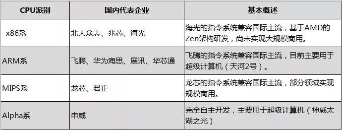 因此,我们迫切需要使用国产CPU来代替以Intel架构为代表的CPU。经过近些年的积累,我国也涌现了诸如申威、飞腾、龙芯等国产化CPU厂商。2018年5月,在《2018-2019 年中央国家机关信息类产品 ( 硬件 ) 和空调产品协议供货采购项目征求意见公告》中,已然增设了“国产芯片服务器”这一新的类别,其中包括龙芯CPU 服务器、飞腾 CPU 服务器以及申威 CPU 服务器。当然,除此之外,还有很多国产CPU厂商在国产化替代中发挥着重要作用。根据不同派别,小新将国内CPU企业进行了分类: