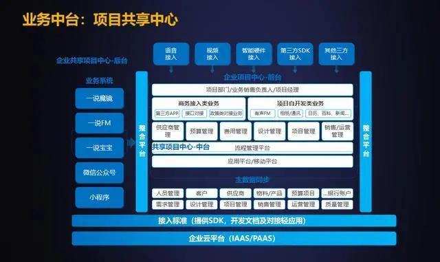 所谓共享的能力,即是项目数据共享的能力。如下是一说科技产品的共享能力,一说系列产品通过整合平台形成了共享项目中心,即项目中台。中台负责传输一说系列产品的相关数据。通过内部系统和业务系统进行消费和使用。不管是接入类业务还是自开发业务,这种共享能力,大大降低了各个项目之间的耦合性。在消费和使用数据层面将会变得事半功倍,从而在提高业务方面也会将事半功倍。