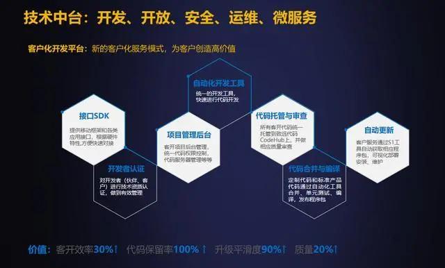 它具备自定义模式的开发运维能力,从一个开发者平台来看,具有接口SDK能力,开发者认证能力,管理后台的能力,自动化开发工具,自动更新等能力。它实现的价值就是提升开发效率,加强运维,突破瓶颈。