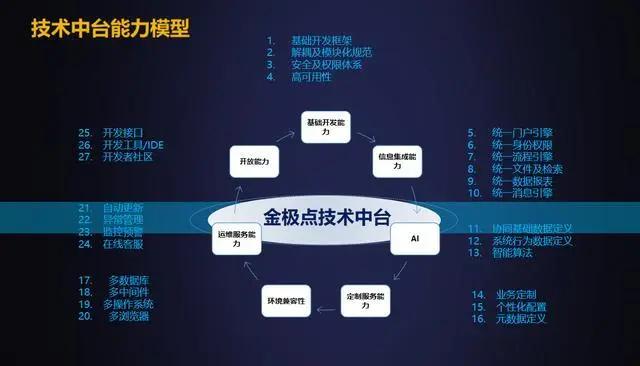 技术中台从能力主要分为开发能力、开放能力、安全能力、运维能力、微服务能力等。