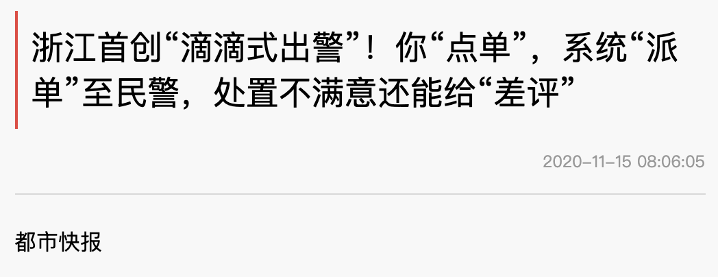 11月15日,据《都市快报》发布的《浙江首创“滴滴式出警”!你“点单”,系统“派单”至民警,处置不满意还能给“差评”》介绍,浙江绍兴警方今年新推出“督察(民意感知)中心”,实现“滴滴式出警”。