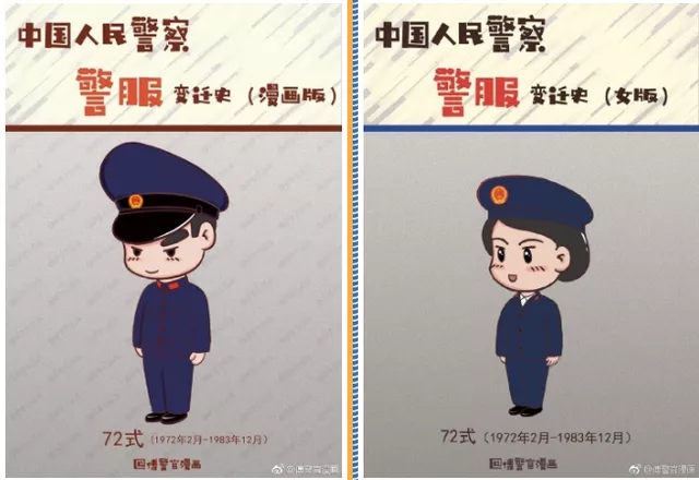“七二式”警服冬夏装上下均为藏蓝色。恢复“五五式”警服大檐帽式样,保留软式解放帽,均为藏蓝色。帽徽为红漆底圆形,中心凸压国徽。