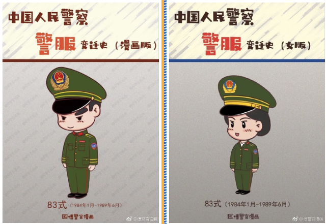 为推动队伍的正规化、现代化建设,适应国家改革开放的需要,1983年,公安部设计制作了“八三式”警服,经国务院批准,于1984年陆续换装。
