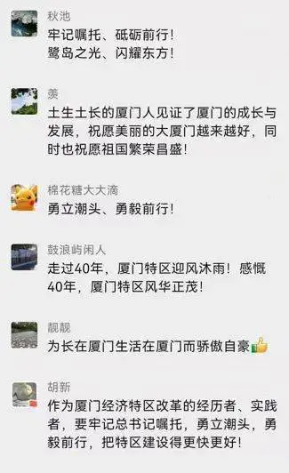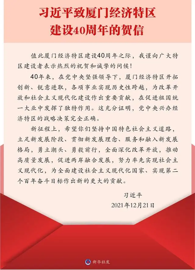 在厦门经济特区建设40周年之际,中共中央总书记、国家主席、中央军委主席习近平发表贺信。贺信指出,40年来厦门经济特区开拓创新、锐意进取,各项事业实现历史性跨越,为改革开放和社会主义现代化建设作出重要贡献,在促进祖国统一大业中发挥独特作用。