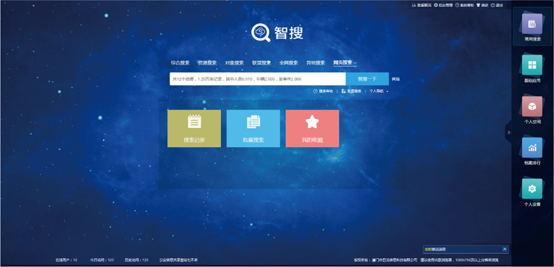 智搜是一款一站式大数据智能检索系统,系统从海量数据中快速分析处理、以解决业务实际问题的角度,采用智能分析、全景档案、对象标签模型等手段,帮助用户快速“秒”准目标,实现对象信息的深度查询,并对目标结果数据实现横向关联、纵向钻取,提供高效率、高价值的对象研判式搜索服务。同时,在融合了联盟机制和请求服务资源后,逐步向组件化、服务化、全网化、研判一体化发展,形成具备一站式能力的兼合性平台。