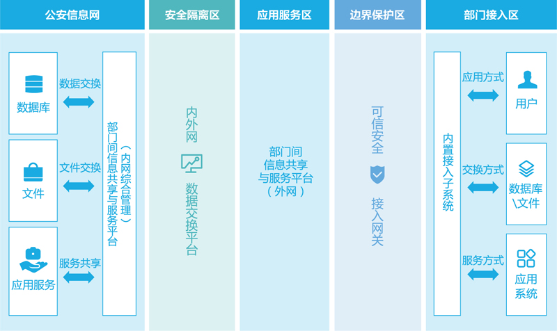 立足于公安部门,解决公安部门与其他外部单位之间的跨部门、跨网络的数据交换与信息共享需求。平台以 数据资源为基础,依托基础网络设施,建设一套“技术先进、安全可靠、切实可行、管控方便”的部门间信息共享与服务平台,在确保业务专网数据的保密性、独立性和完整性的同时,实现信息资源安全可控的交换共享,打破部门间数据孤岛、实现资源互联互通,适应大数据时代的数据共享交换。