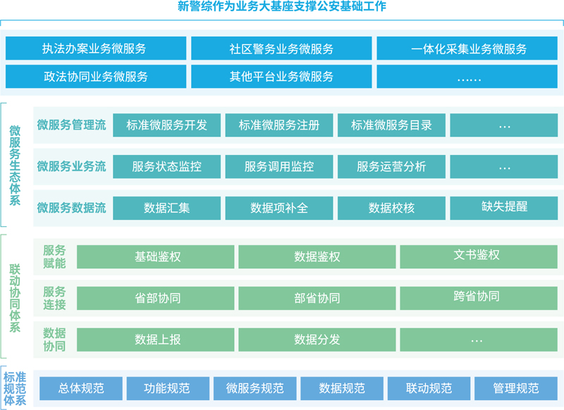 遵循大数据智能化总体规划和公安部关于新警综总体建设要求,以各省市警务云平台和大数据平台为底 座,打造统一架构、统一协同、统一服务、统一数据的“业务大基座”,支撑执法办案、社区警务、一体化采集、政法协同等公安基础业务,促进警综业务应用智能化升级,更好赋能基层民警。