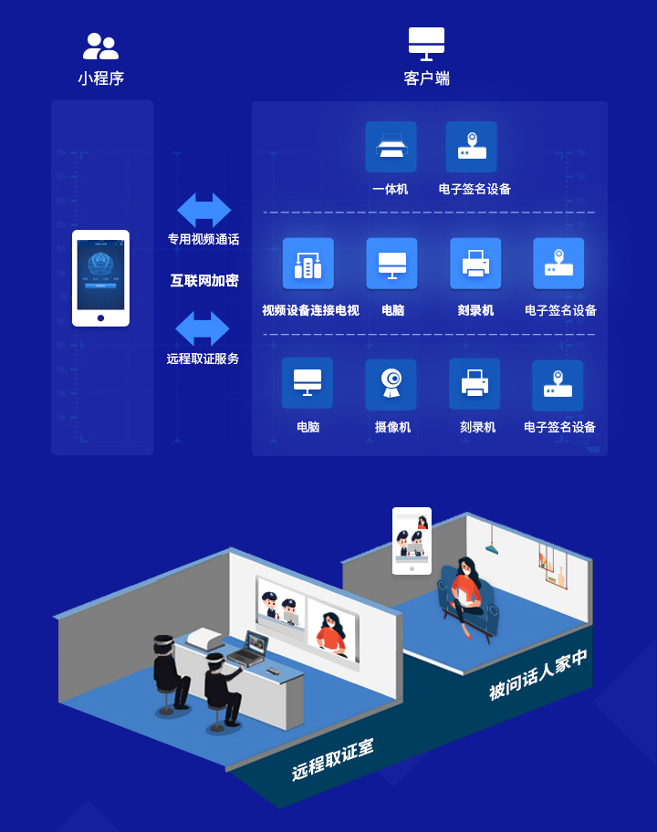 系统还具有快捷笔录、群体性案件协同问话、专家远程指导侦查、笔录过程监督、案件关键线索提取、自动核查、联盟核查、交叉分析等功能,支持与多个厂家的电子签名按捺设备对接,实现笔录文书电子化。法度“视证通”贴合基层执法业务需求,在安全可靠,满足法律效力要求的前提下,通过远程可视对话、远程示证、文件签字、询问笔录制作、全过程录音录像、视频刻录等功能,实现执法人员与取证对象之间进行远程取证。