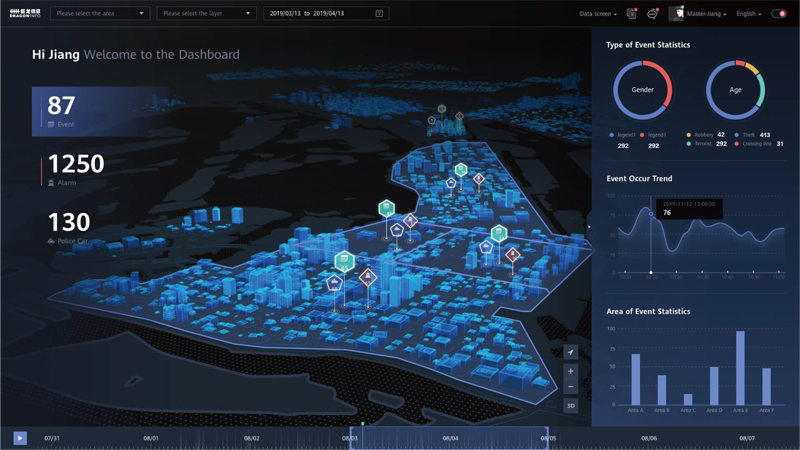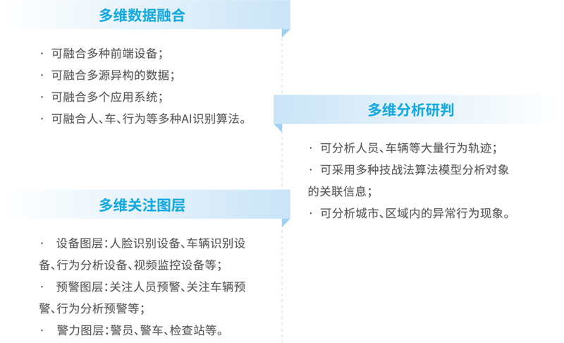 基于云平台,利用大数据引擎、AI引擎、模型引擎,提供全息布控、智能检索、综合态势感知等能力,辅以人员时空大数据分析、车辆时空大数据分析、多维大数据分析等研判技战法,实现态势感知、威胁感知、线索感知,高 效辅助治安防控、指挥调度和侦查破案,打造城市智慧大脑。