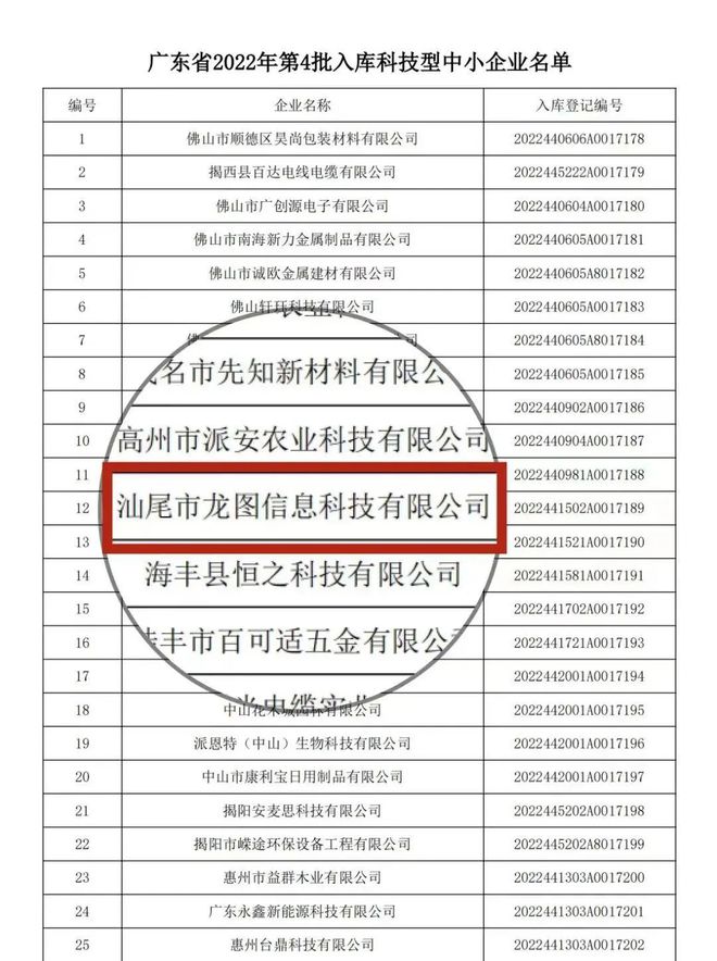 近日,广东省科学技术厅发布关于2022年第四批入库科技型中小企业的公告,汕尾市龙图信息科技有限公司顺利入选。科技型中小企业是科技部授予的资质备案,是企业创新能力“认证”标志。作为最具活力、潜力、成长性的创新群体,科技型中小企业已成为发展新动能的重要载体。