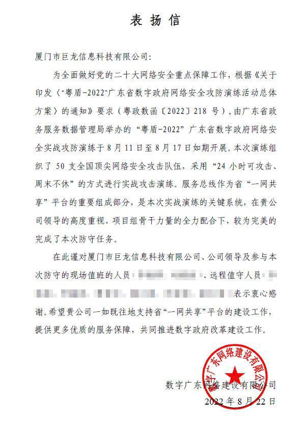 近日,巨龙信息收到数字广东网络建设有限公司(数字广东)发来的感谢信。信中数字广东对巨龙信息项目组团队全力配合完成广东省数字政府网络安全实战攻防演练保障任务,在工作中的担当和贡献表示由衷感谢。