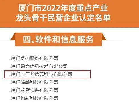 此次龙头骨干民营企业申报分为平板显示、计算机与通讯设备、半导体与集成电路、软件和信息服务、机械装备等13个领域,共117家入选。经过评审单位的层层选拔,巨龙信息凭借科技实力入选厦门市2022年度重点产业龙头骨干民营企业认定名单。