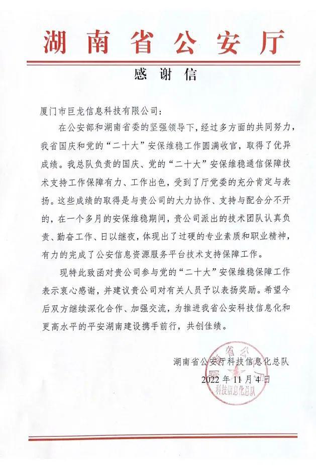 近日,湖南省国庆和“二十大”安保维稳工作圆满收官,取得了优异成绩。巨龙信息湖南现场团队安保期间响应及时、保障得力、工作出色,收到湖南省公安厅科技信息化总队的感谢信!