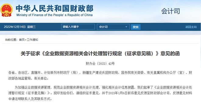 12月9日,财政部发布《企业数据资源相关会计处理暂行规定(征求意见稿)》(以下简称《暂行规定》),拟规范企业数据资源相关会计处理,强化相关会计信息披露,发挥数据要素价值,服务数字经济发展和数字中国建设。