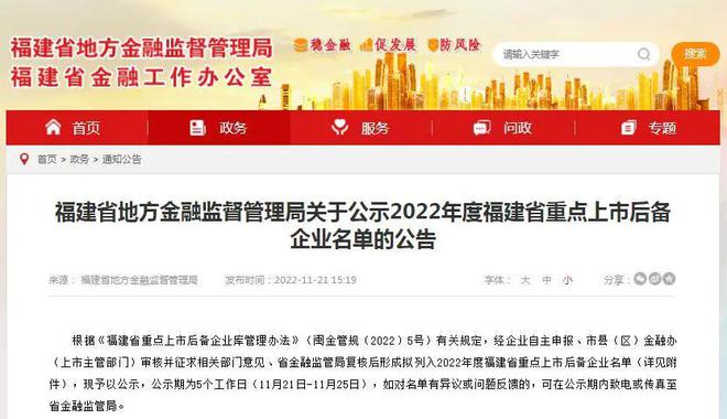 根据《福建省财政厅 福建省地方金融监督管理局关于修订〈福建省推动企业直接融资专项资金管理暂行办法〉的通知》和《福建省重点上市后备企业库管理办法》有关规定,经企业自主申报、省市县(区)三级审核复核、公示等相关程序,确定了福建省重点上市后备企业名单。相关企业纳入省重点上市后备企业库的有效期从2022年5月31日至2024年12月31日。