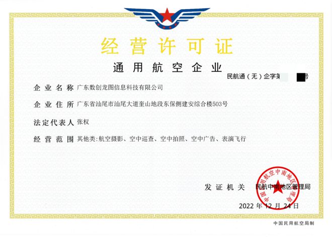 日前,广东数创龙图信息科技有限公司(简称:广东龙图)获得由民航中南地区管理局颁发的《通用航空企业经营许可证》,核准经营范围包括:航空摄影、空中巡查、空中拍照、空中广告、表演飞行等空中领域。