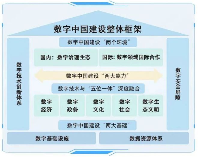 《规划》明确,数字中国建设按照“2522”的整体框架进行布局,即夯实数字基础设施和数据资源体系“两大基础”,推进数字技术与经济、政治、文化、社会、生态文明建设“五位一体”深度融合,强化数字技术创新体系和数字安全屏障“两大能力”,优化数字化发展国内国际“两个环境”。
