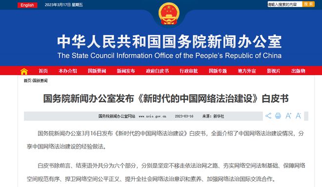 3月16日,国务院新闻办公室发布《新时代的中国网络法治建设》白皮书,指出中国积极探索司法活动与网络技术深度融合的新路径、新领域、新模式,让社会正义“提速”。