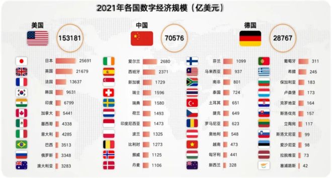 中美欧形成全球数字经济发展的三极格局。2021 年,从规模看,美国数字经济 蝉联世界第一,规模达 15.3 万亿美元,中国位居第二,规模为 7.1 万亿美元。从占比看,德国、英国、美国数字经济占 GDP 比重均超过 65%。数字经济也成为驱动我国经济发展的关键力量。