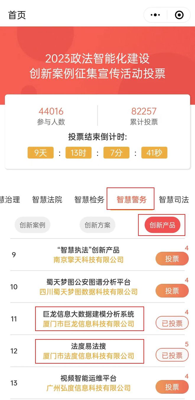 进入投票小程序后,点击“智慧警务”→“创新产品”。为“巨龙”、“法度”投票!