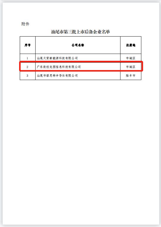 近日,汕尾市金融工作局发布《关于认定汕尾市第三批上市后备企业的通知》,广东数创龙图信息科技有限公司被评定为汕尾市第三批上市后备企业。