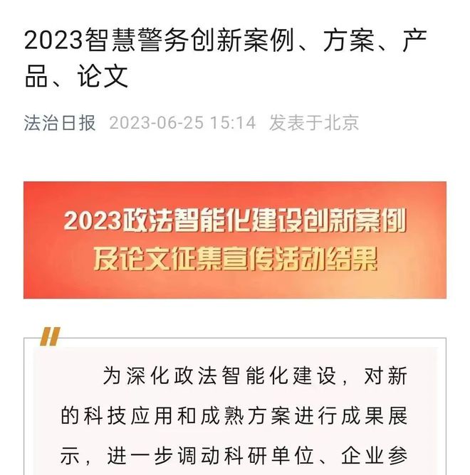 6月25日,由中央政法委机关报法制日报社主办的——2023政法智能化建设创新案例及论文征集宣传活动结果揭晓