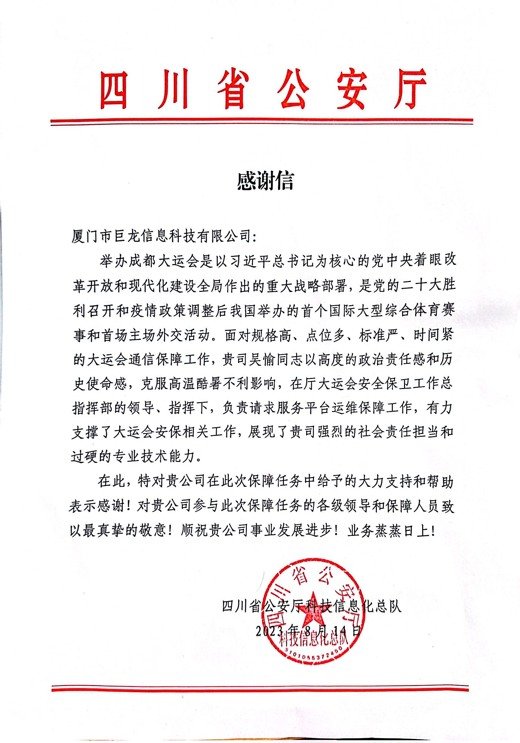 近日,第三十一届世界大学生夏季运动会在成都圆满落幕,巨龙信息现场技术人员凭借过硬技术和优质服务圆满完成系统保障工作,收到来自四川省公安厅科信总队的感谢信,高度肯定现场技术人员专业的技术能力和尽职尽责的敬业精神。
