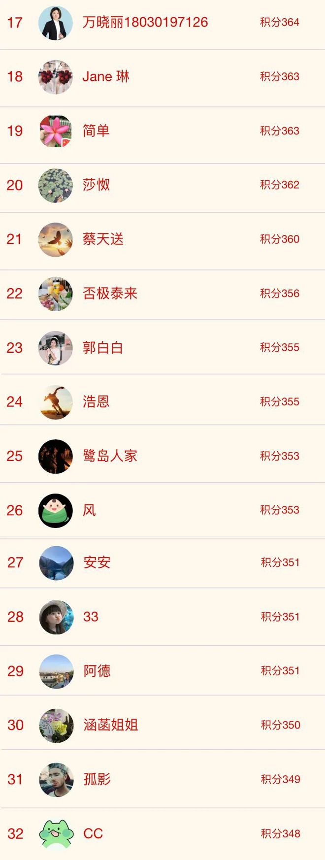 积分排行第17-32名:微信红包20元