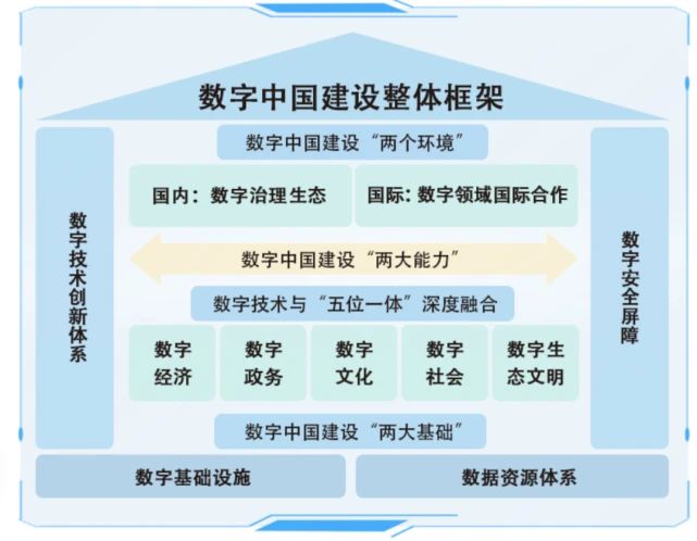 未来数字经济之路怎么走?《数字中国规划》已给出答案:数字中国建设按照“2522”的整体框架进行布局,即夯实数字基础设施和数据资源体系“两大基础”,推进数字技术与经济、政治、文化、社会、生态文明建设“五位一体”深度融合,强化数字技术创新体系和数字安全屏障“两大能力”,优化数字化发展国内国际“两个环境”。