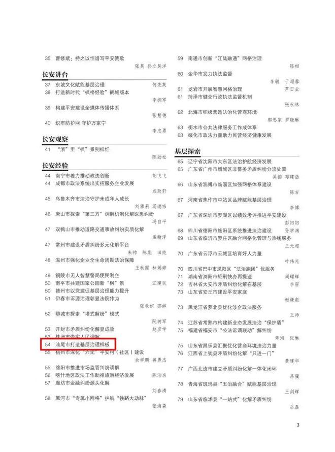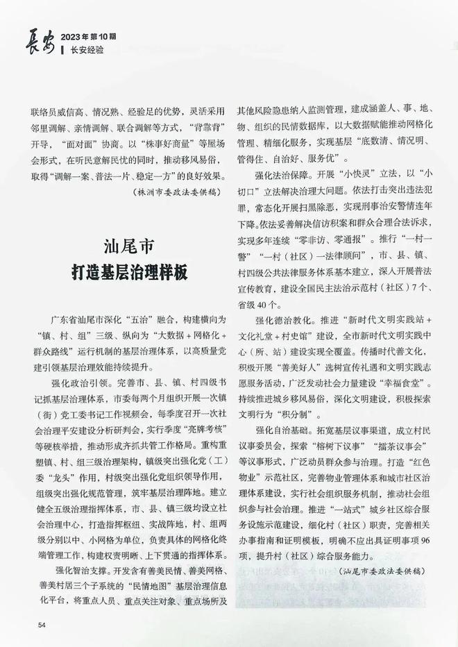 近日,中央政法委主管的《长安》杂志在2023年第10期“长安经验”专栏中,刊发《汕尾市打造基层治理样板》,重点介绍汕尾市基层治理工作经验和做法广受关注。